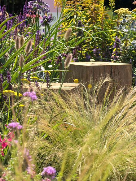 An eye-catching and colourful pocket encouraging you to pause, take a perch and reconnect with nature inspired by the experimental ‘Dry Meadow’ at West Dean Gardens, Sussex, and gravel garden planting schemes using draught tolerant plants that are good for pollinators and can thrive and survive in a warming climate.